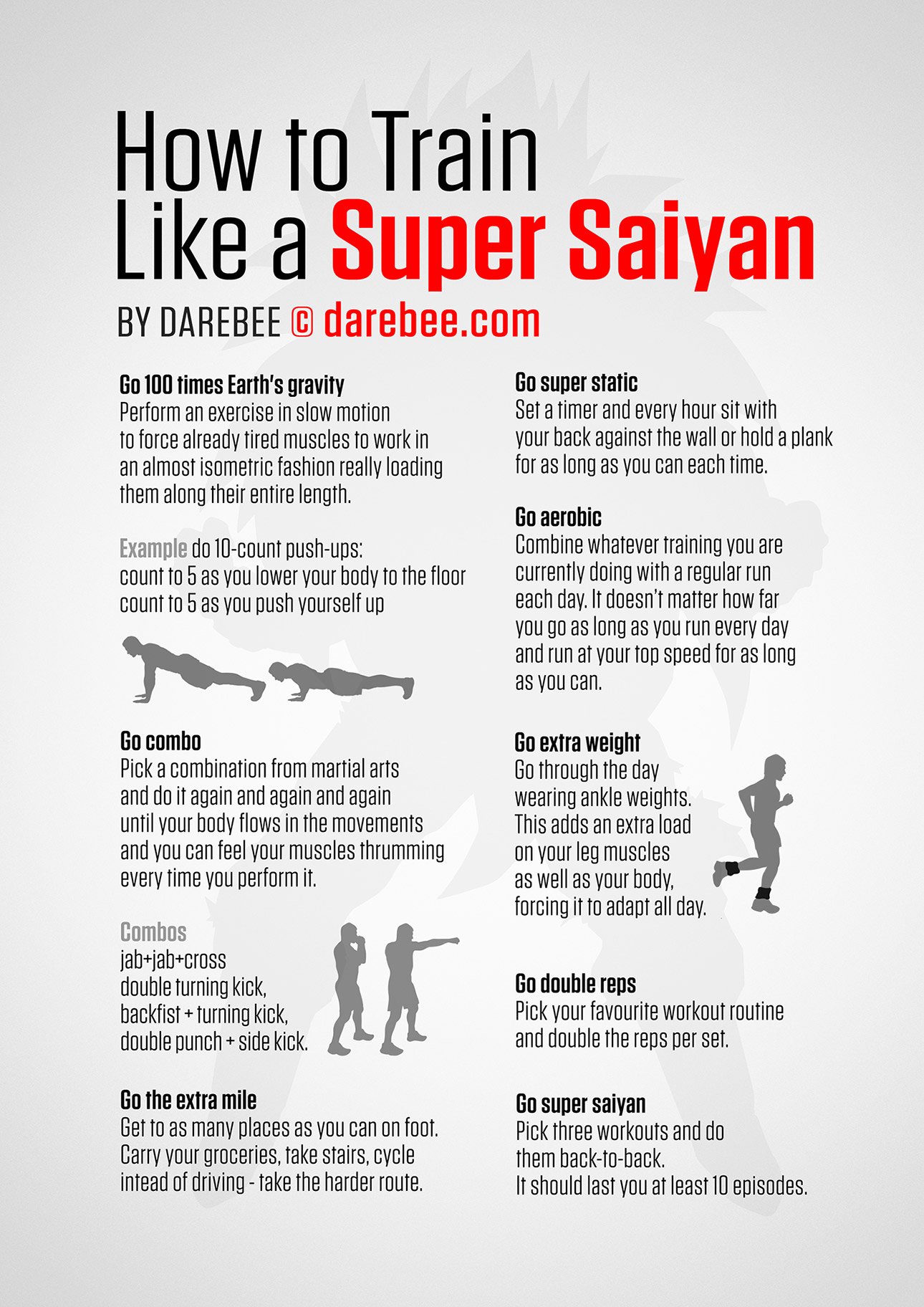 There is only one rule: the moment you can do something raise your standards – that’s the key to training on a Super Saiyan level. If you can do 100 sit-ups, go 200. If you can do 100 push-ups, go 200. If you can run 10K go faster, go longer, run with a heavy vest Goku-style. Turn your every activity into a challenge and never, ever take shortcuts.